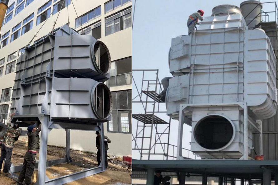 在磷化工、石墨、有色冶煉等行業(yè),生產(chǎn)排放的飽和濕煙氣與低溫環(huán)境空氣接觸時,在煙氣溫度下降過程中,煙氣中的水蒸氣過飽和凝結(jié),凝結(jié)水滴折射和散射光線,使煙羽呈白色或灰色,稱為濕煙羽。由于冬季溫度較低,相關(guān)問題的環(huán)保投訴較多。那么,有哪些種煙氣脫白技術(shù)?各種煙氣脫白的技術(shù)原理是怎樣的?1、冷凝相變煙氣脫白技術(shù)冷凝相變煙氣脫白原理為:煙氣經(jīng)濕法脫硫后,含濕量上升,為B狀態(tài),進入換熱消霧模塊后。干態(tài)空氣A入換熱消霧模塊兩者交換后,A溫度上升,含濕量不變,相對濕度降低,處于C。B煙氣,溫度降低,相對濕度不變,含濕量降低,液滴析出,轉(zhuǎn)為D。D和受熱C流出換熱消零模塊,在氣室中混合,使D溫度下降,濕度降低:C溫度上升,相對濕度上升,兩種狀態(tài)的煙氣混合,最終達到F狀態(tài),AF連線始終處于不飽和狀態(tài),因此,不會出現(xiàn)可見白煙或霧氣團。可以看出,冷凝混風(fēng)技術(shù)是煙氣脫白的較好技術(shù)路線,特別是在北方寒冷地區(qū),單純的煙氣再熱很難消除煙囪白煙。2、低電耗離子束煙氣脫白技術(shù)低電耗離子束煙氣脫白原理為:高速電子射流擊穿煙氣,產(chǎn)生正負離子體基團,煙氣中氣溶膠、飽和水滴、微小顆粒物在離子束的撞擊下,不斷發(fā)生凝聚效應(yīng),顆粒物和水滴快速凝聚成團,在重力作用下,落到離子束除變器底部流入脫硫塔或廢水收集池,達到降解顆粒物,氣溶膠和水零的目的。廢氣中的氨氧化物,由高速電子束提供能量,快速與氨氣發(fā)生還原反應(yīng),生成副產(chǎn)物水。低電耗離子束煙氣脫白優(yōu)點:1.放電產(chǎn)生的離子體中,電子能量高,幾乎可以和所有的惡臭氣體分子作用。2.反應(yīng)快,不受氣速限制。采用防腐蝕材料。3.用電成本低,操作極為簡單,無需派專職人員看守,基本不占用人工費。4.設(shè)備啟動、停止十分迅速,隨用隨開,不受氣溫的影響。